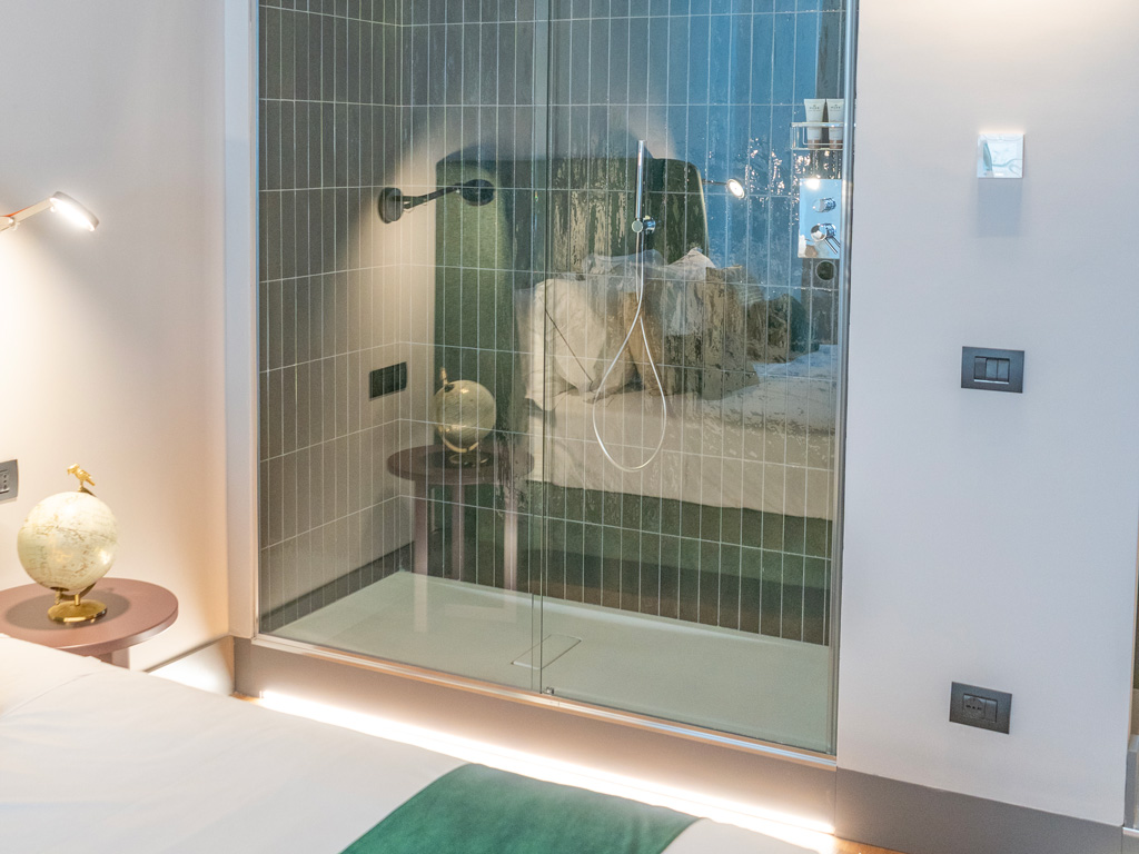 Suite con letto king size con doccia a vista di fianco al letto e soffitto con travi in legno. Dimensione della suite: 34 m².