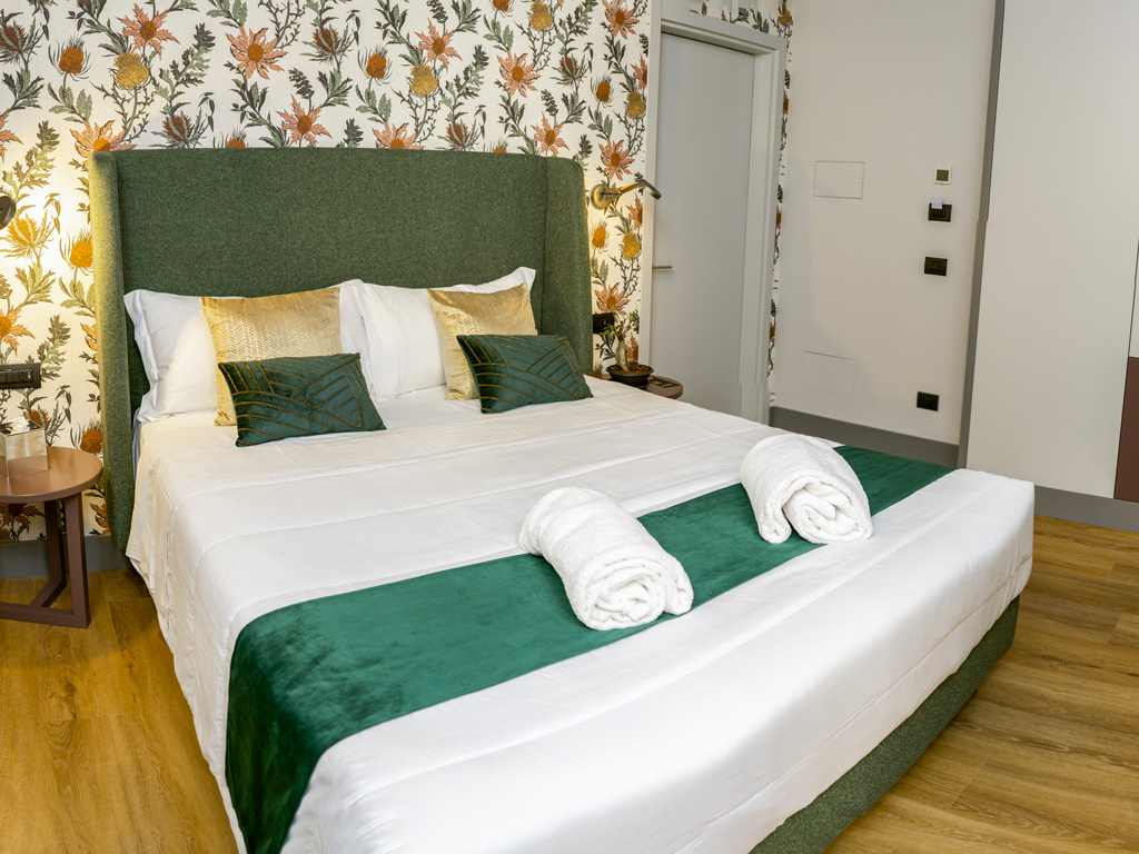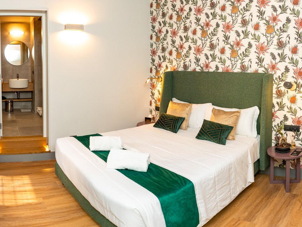 Suite con letto matrimoniale, decorata con carta da parati e dotata di smart tv. Dimensione della suite: 16 m².